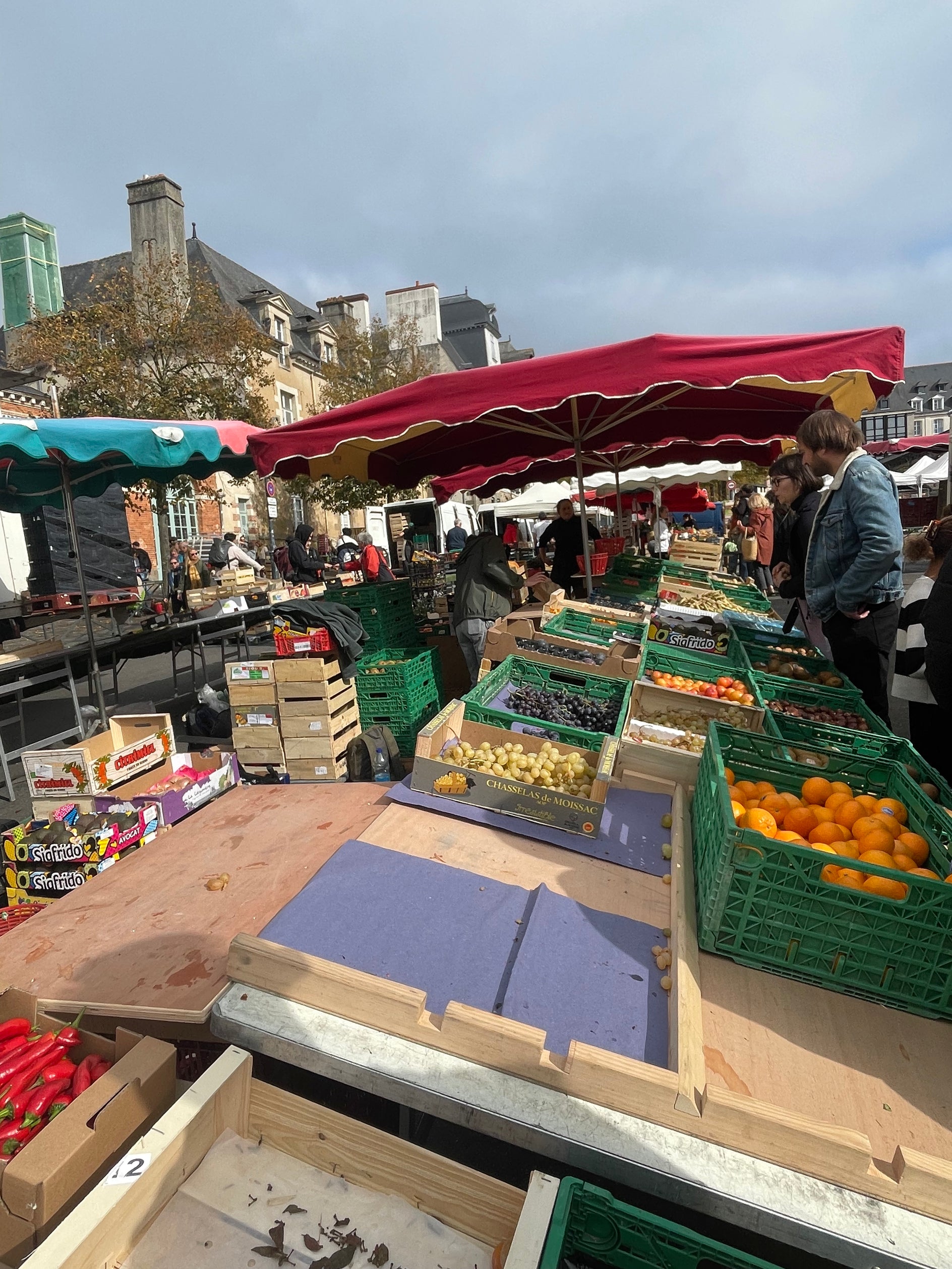 Rennes’ famous weekend market lined with stalls overflowing with cheese, bread, flowers, and chatter.